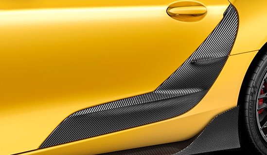For the nose TRD has devised a lower front lip using carbon fibre for its construction. Matching this is a set of carbon fibre side skirts which seem to match nicely with the factory ‘sideburns’ on the new Supra. The side panel is also swapped for a carbon fibre piece.
