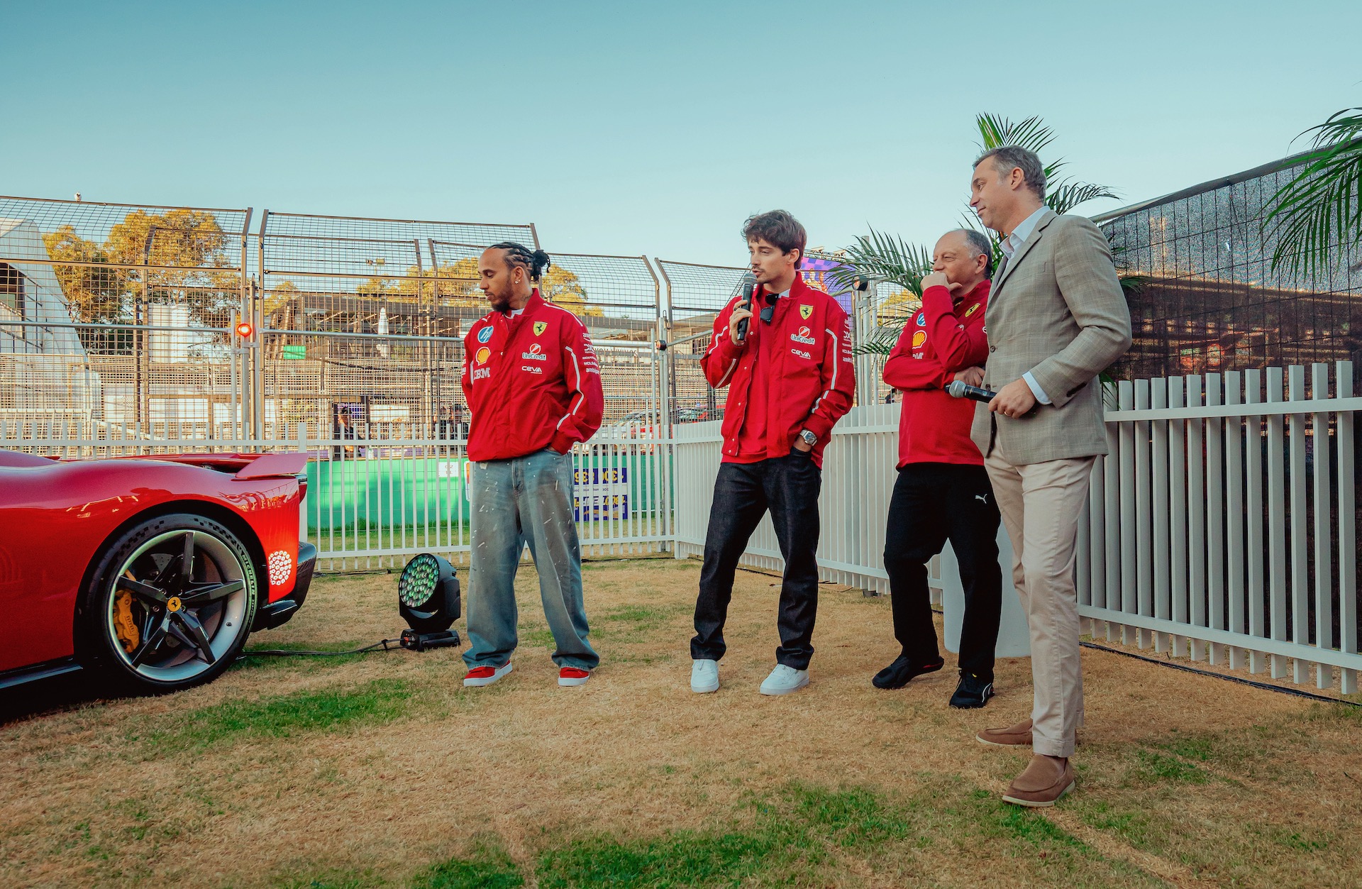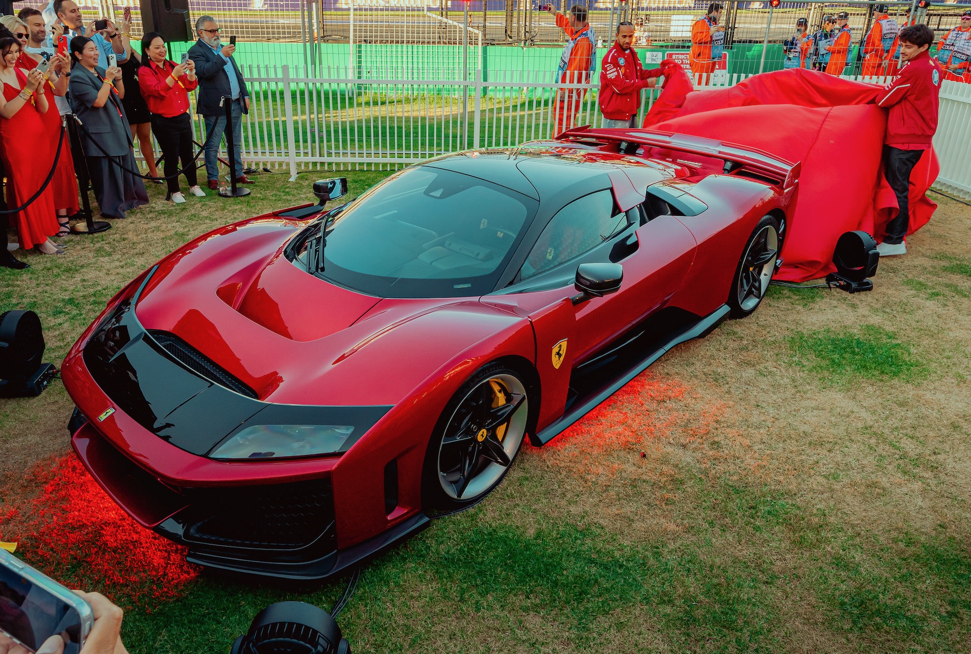 The debut took place at Casa Ferrari, an exclusive trackside venue, with Scuderia Ferrari drivers Lewis Hamilton and Charles Leclerc making a special appearance to introduce the marque’s most powerful road car yet.
