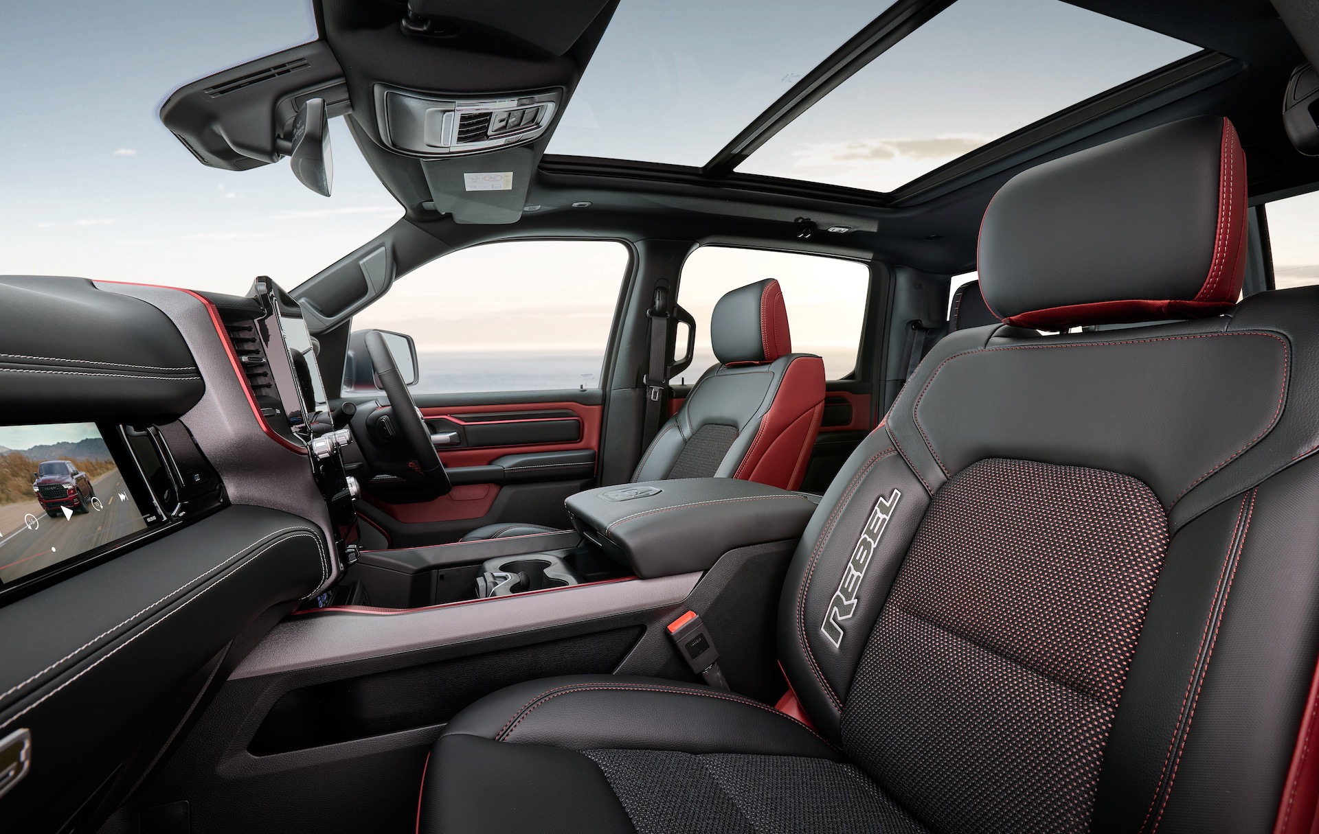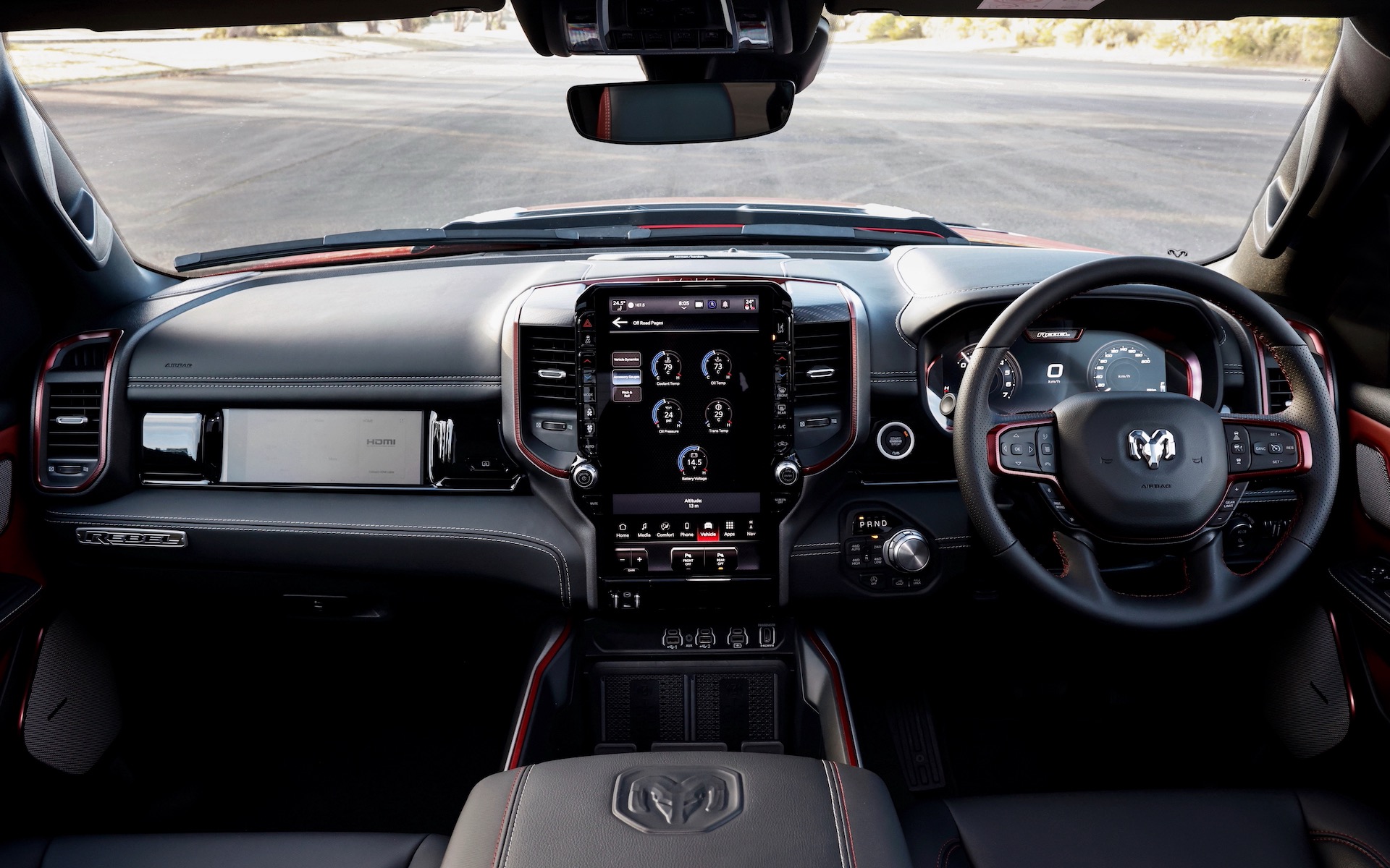 Technology is also a highlight. The Rebel inherits the same premium equipment you get in the Laramie Sport, including a massive 14.4-inch central touch-screen, a 12-inch digital driver’s cluster, and even a 10.25-inch passenger-side screen. Don’t worry about passengers distracting you with that screen as it features a special privacy film over the top, so it doesn’t show any display from the angle of the driver’s seat.
