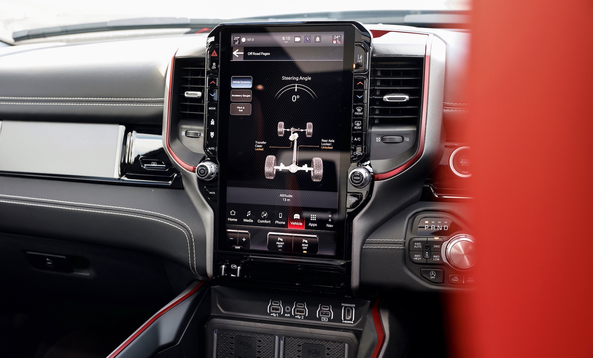 At the front you have an approach angle of 20.9 degrees, up from 20.2 in the Laramie Sport. Again, not a major difference. The ramp-over angle is 19.2 degrees, up from 18.7, and the departure angle is 22.2, up from 21.7. That’s despite coming equipped with a one-inch lift.
