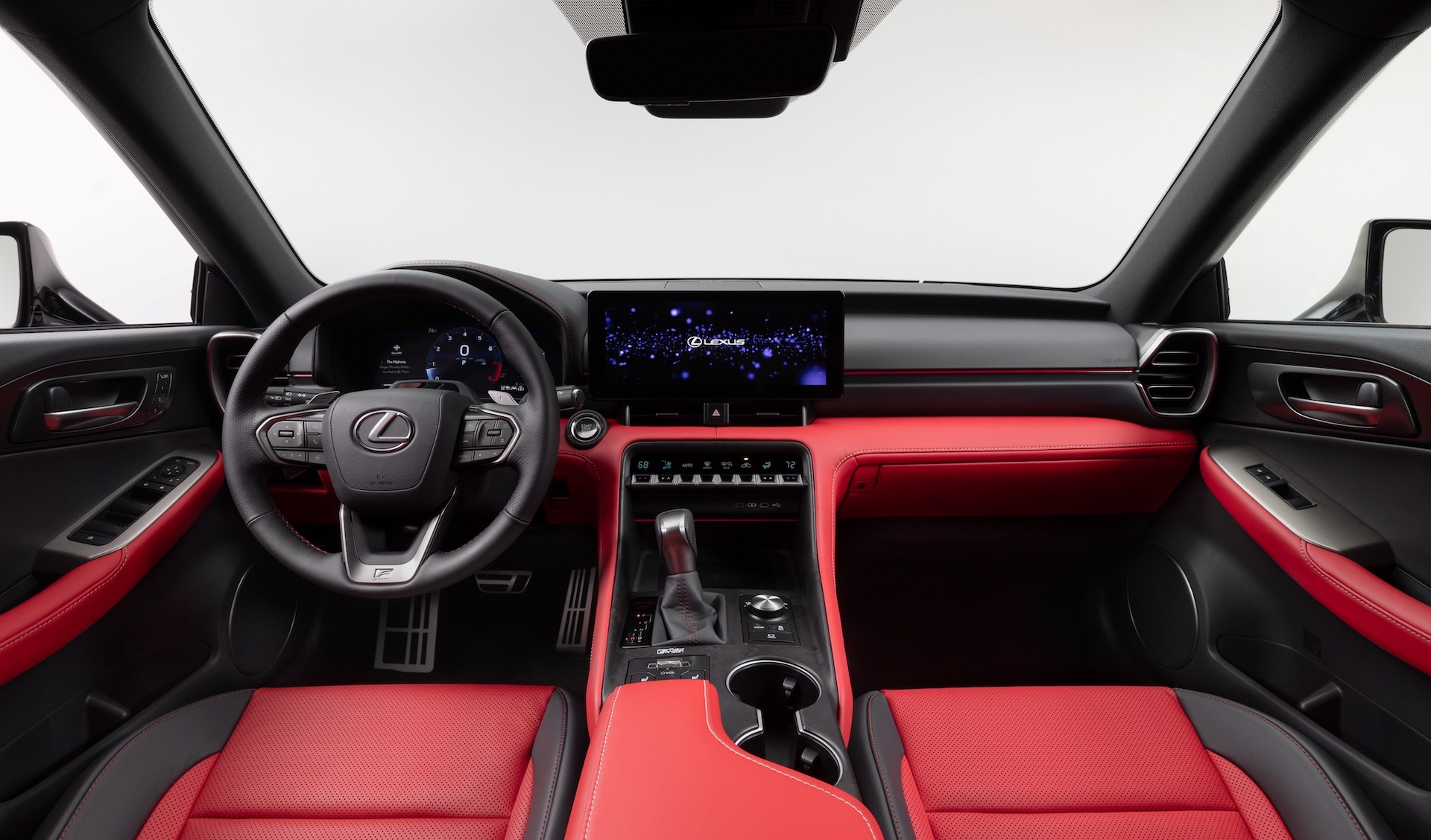 Inside, Lexus has introduced a larger 12.3-inch multimedia screen and matching gauge cluster, while newly introduced Forged Bamboo trim provides a distinctive texture across the console and start button surround. A striking new interior theme called Prominence brings bold red tones inspired by solar flares.