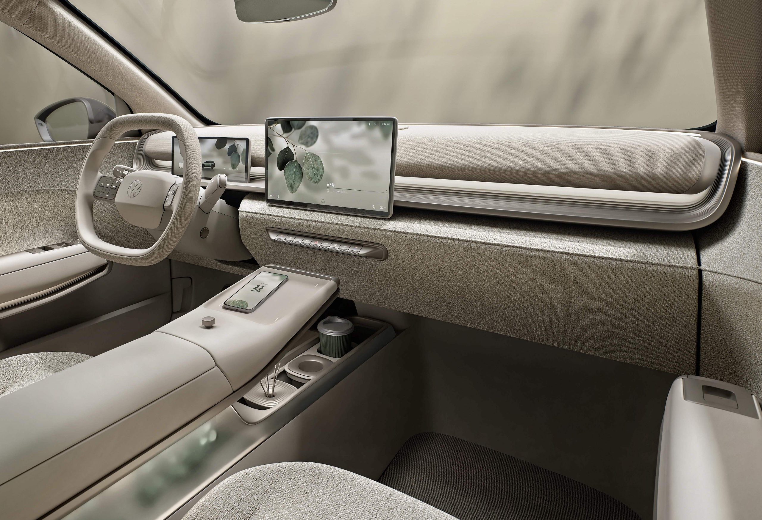 It’s the interior where the real magic is, with a minimalist and inviting ambience. Light tones and fabric have been cleverly used, with fabric lining the doorsills, lower dash and seats. A floating console with dual phone chargers sits above a configurable storage compartment with cupholders.