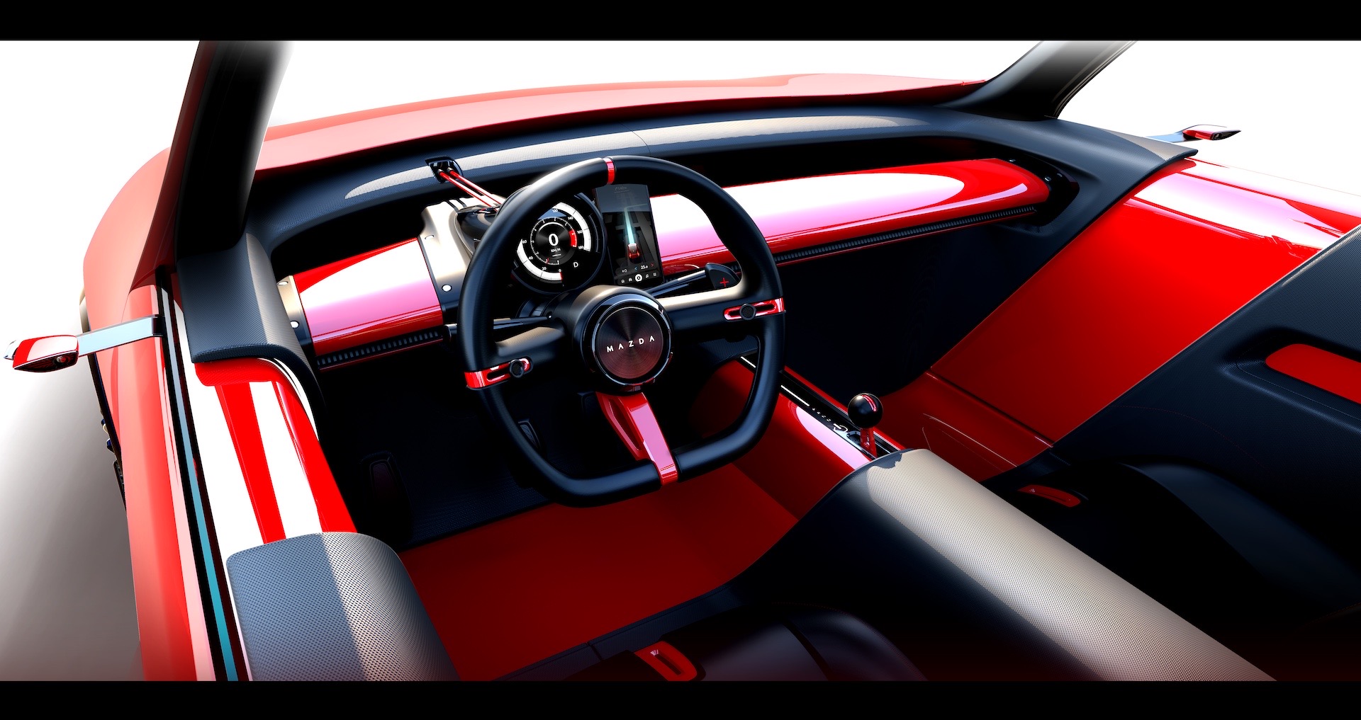 It features the more mature and recent expression of Mazda’s Kodo design philosophy, with a minimalist surface treatment. A tubular pod for the instruments echoing watches encompasses speed, redline and range, with an integrated phone holder next to it.