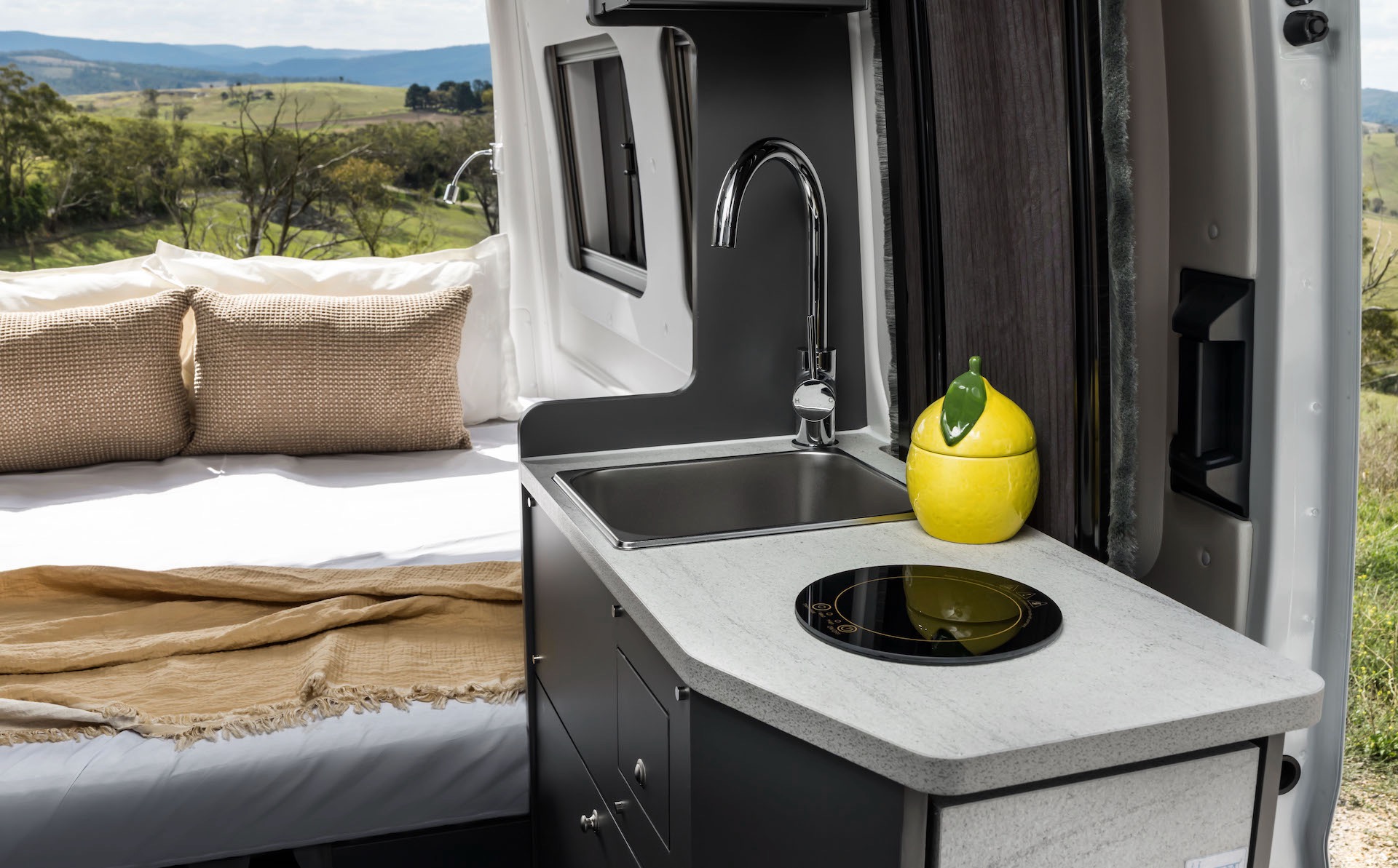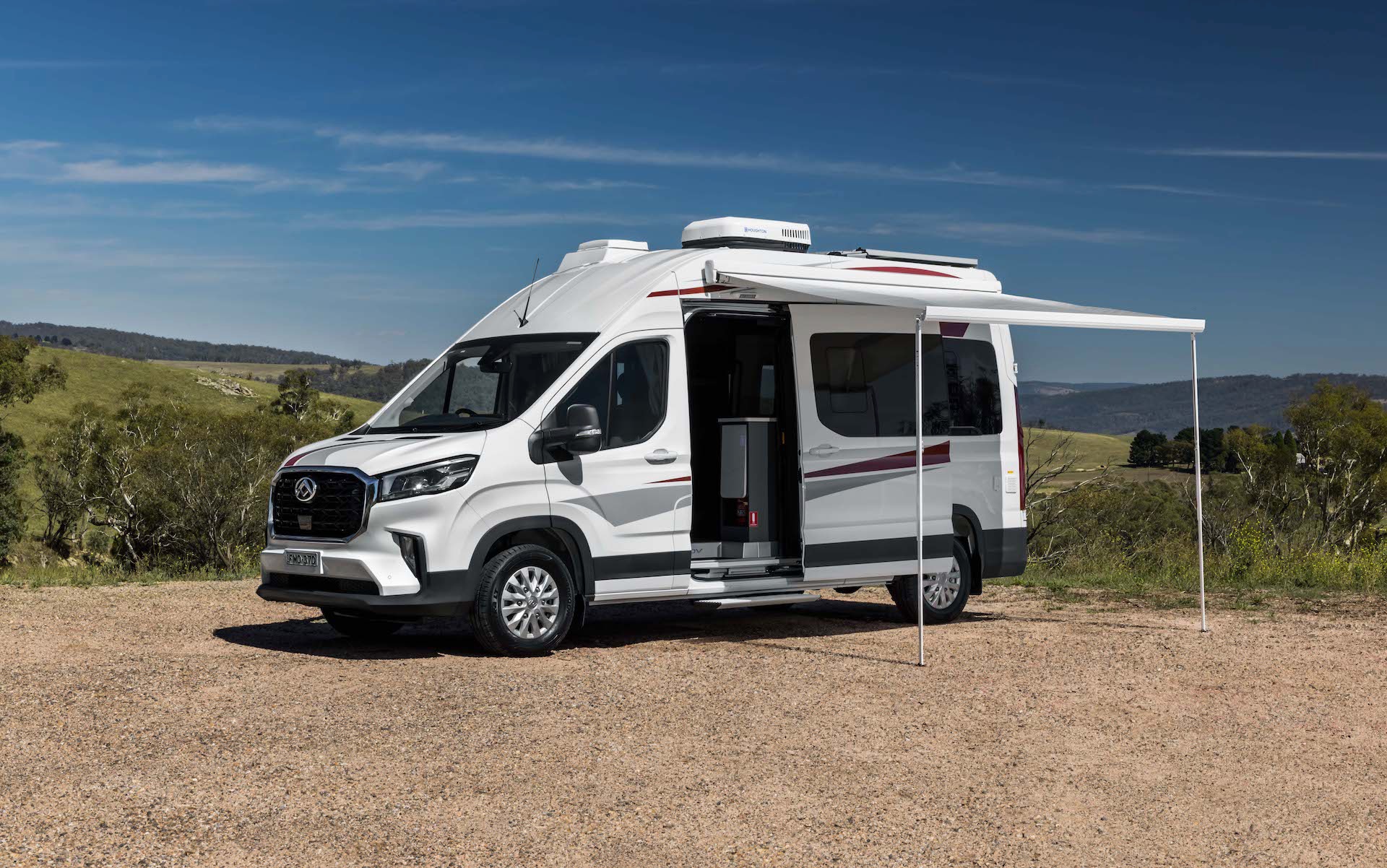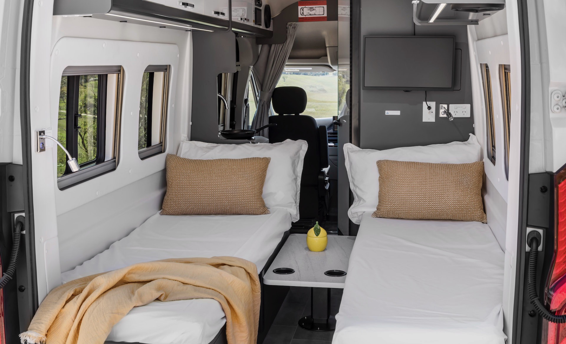 Standard equipment in the two-seater includes an indoor shower and toilet, outdoor shower, induction cooktop, microwave, 83-litre drawer fridge with 7-litre freezer, 22-inch smart TV, retractable awning, electric side step, and a lounge that converts into a double bed.
