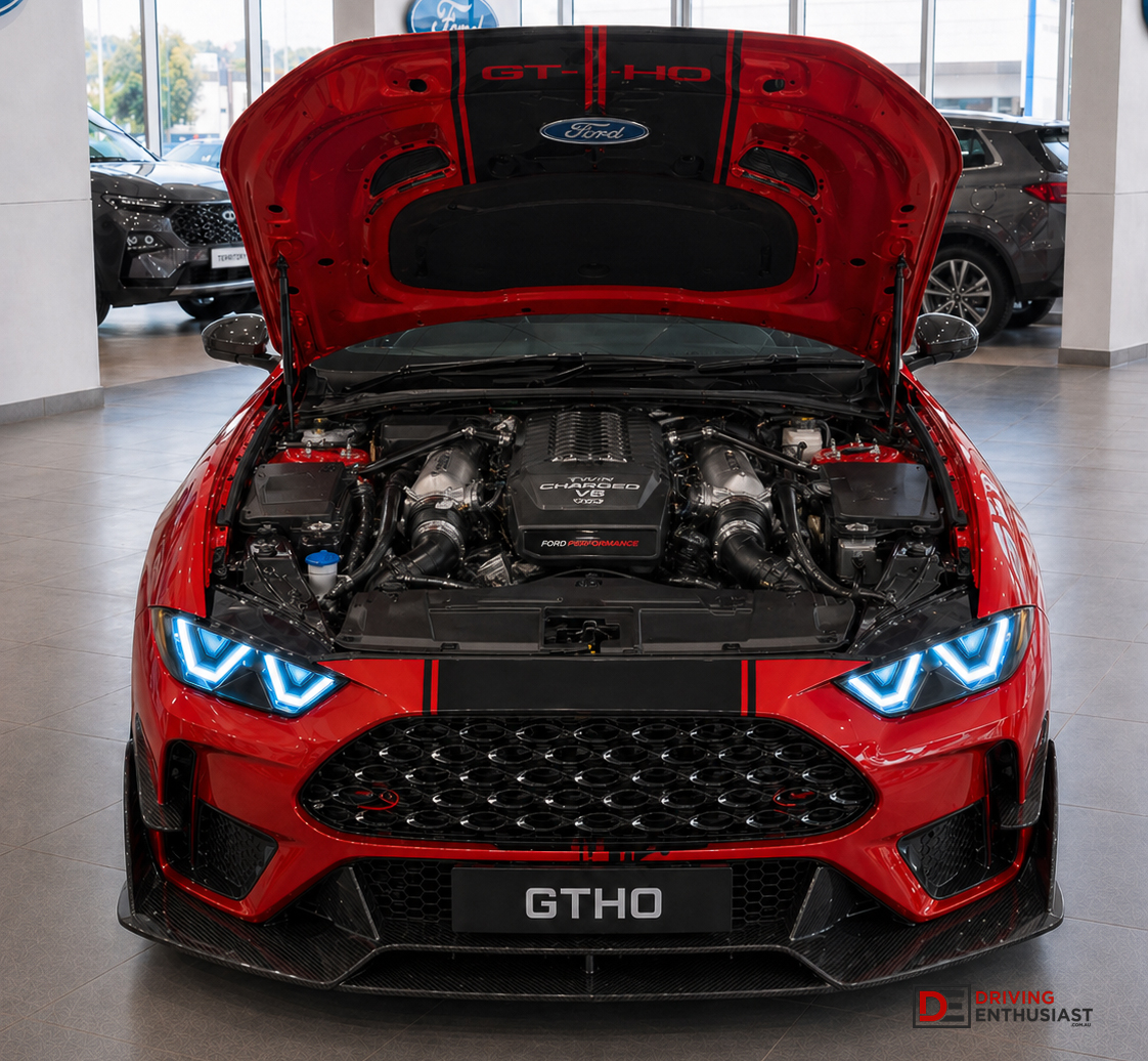 The GTHO is the one nobody asked for and everybody secretly wants. It uses a 5.2-litre twin-charged V8 with a positive-displacement supercharger mounted in the valley and twin turbochargers on the hot side of the vee. No battery assistance, no electric torque fill, no apologetic mild-hybrid badge on the boot. Just 620kW, 980Nm, a Hollinger paddle-shift sequential rear transaxle, and enough cooling hardware to make the front end look like it belongs at Bathurst. The target tare weight is 1875kg and the weight distribution is 51:49. It is not sensible, but neither was the phase of Australian performance history that made the GTHO name matter in the first place.